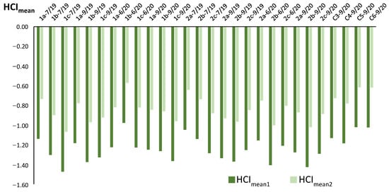 The HCI is only applicable to the samples of whole honey bee bodies (B) and for the elements for which threshold values are known in the literature [,,], i.e., Cd, Pb, Cr, and Ni; their thresholds are 0.1, 0.7, 0.12, and 0.3 mg kg−1 for threshold1 and 0.05, 0.3, 0.04, and 0.1 mg kg−1 for threshold2, respectively. The conversion of these values from wet to dry weight values was made considering a weight loss of 68% due to the drying process [].