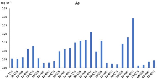 The average level of contamination of As found in the bees of Alviano Lake (0.105 mg kg−1; Figure 4) is, however, lower than what was found in the study of Van der Steen et al. (2016) [] conducted throughout the Dutch territory on 150 apiaries (As: average 0.85 ± 0.33, range 0.13–1.64 in mg kg−1). In addition, these results [] were comparable to those found in the previous survey conducted in 2006 at the three Dutch sites of Maastricht (urban area with industries), Buggenum (rural area with a power plant), and Hoek van Holland (port and large industrial area), with an average value of As of 0.71 ± 0.02 mg kg−1 [].