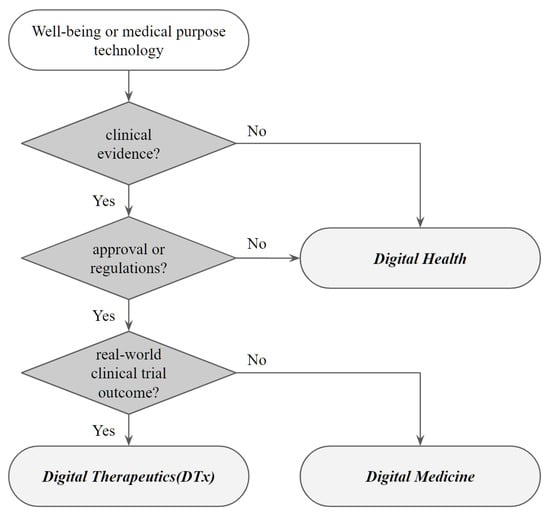 For the definition of digital therapeutics, digital health and digital medicine are similar terms that are often misused in research. Digital health has the most comprehensive scope, and digital medicine and digital therapeutics are included in it. According to Figure 1, clear clinical evidence is required to classify digital health medicine from digital health []. Digital health refers to technologies aimed at improving the user’s well-being or health in everyday life, but it does not necessarily have to include clinical evidence. However, both digital medicine and digital therapeutics require a definite medical evaluation. In particular, to be classified as a digital therapeutic product, the medical technology must prove its effectiveness with real-world data results through clinical trials.