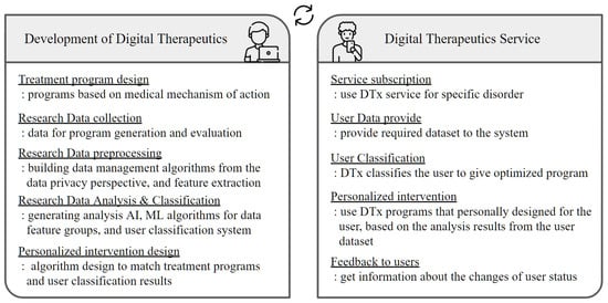 Digital therapeutics require an accurate data analysis in both the development and service steps, as shown in Figure 2. Since DTx utilizes medical datasets, a high rate of sensitivity and specificity performance is required from the data analysis. For example, during the development stage of DTx, it is necessary to analyze the processed research data to generate algorithms for diagnosis, classification, and treatment recommendation. Moreover, from the perspective of service users who wish to use DTx, they expect accurate analysis results on their medical condition and optimally personalized treatments based on their data. Therefore, AI technology using various machine learning techniques is applied to each step.