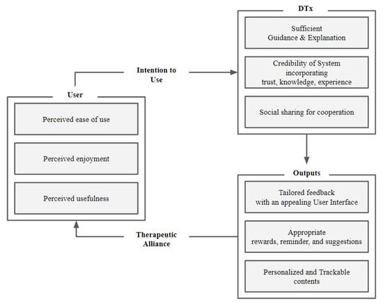 Regardless of the kinds of technology implied in DTx, user interactivity must be sufficiently satisfied. In the case of DTx, unlike conventional medical services, it is possible to empower users to participate actively in treatment programs. However, at the same time, since self-management is required, motivation must be provided for appropriate compliance [,]. This empowerment and motivation can be provided through sufficient interactivity of the services. For this, there are a few suggestions about user-centered human–computer interaction components from earlier DTx studies. Furthermore, the therapeutic alliance is also considered necessary, especially in mental-healthcare-related areas where DTx has been most widely applied in recent years. The therapeutic alliance (TA), which refers to the rapport and the relationship between physicians and patients in existing mental health treatment programs, remains a crucial factor in digital formation []. Therefore, to secure such a therapeutic alliance, the HCI factors must be considered [].