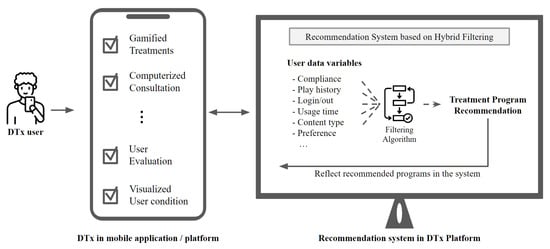 The digital therapeutics products may apply a hybrid-filtering recommendation system among the structures as shown in Figure 5. For example, Bhatti designed the clinical care system, which used an fb-KNN algorithm-based RS for data collected when diagnosing and treating diseases []. Furthermore, Ihnaini presented a diabetes prediction method, which adopted a machine-learning-based smart healthcare RS for electronic health records []. As such, DTx can collect information about users from devices and mobile applications and apply recommendation systems in more detail than pharmaceutical approaches or offline treatment programs. In the future, the performance of DTx products will be determined based on how detailed the provided user-specific treatment is.
