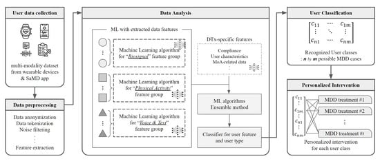 To understand the user’s detailed characteristics through the multimodal approach, data features that have undergone the preprocessing step are grouped into similar clusters before the data analysis. Then, each feature group is analyzed through a machine learning algorithm that fits its data structure. Since the disorder-related variables for each feature group are different, our team did not integrate extracted data features into one embedding layer. Therefore, each feature group with a biosignal, physical activity, voice, and text separately has a corresponding machine learning algorithm. The trained result leads to generating an integrated classifier, and at that time, the feature-trained result for the specific feature collected from the DTx application is also added. At the beginning of the system, the DTx usage information does not come in due to the lack of stored data, but the importance of this section increases as the user continues to use the DTx application. These results significantly impact user classification and personalized-intervention-providing algorithms.