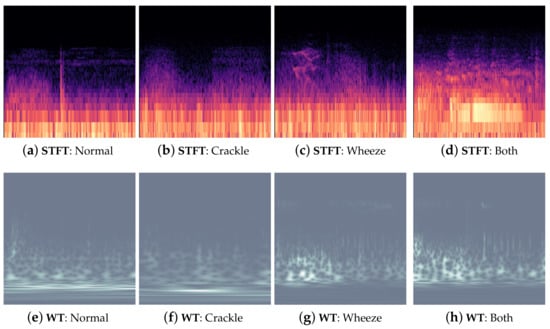 Firstly, 920 examples of annotated respiratory sound data were clipped into 6898 respiratory cycles. Since the ICBHI 2017 data were collected in different hospitals with different environment noises, including the human voice and heartbeat, we used a third-order Butterworth band-pass filter to remove the environment noise sound below 10 Hz or larger than 4000 Hz [], and normalized the signal to 0 and 1. The short-time Fourier transform (STFT) method [] was used to extract the features of the respiratory sounds in the time and frequency domain. However, the data were collected in different hospitals with different types of equipment. As a result, the ICBHI 2017 sound data have two sampling frequencies, 4000 Hz and 44,100 Hz. The length of a respiratory cycle may vary between 0.2 s and 16.2 s for ICBHI 2017 data, with a mean equal to 2.7 s. Thus, if we let both the hop length and the window length of the STFT filter be proportional to the sampling frequency, the output spectrogram would have a distinct shape for sound data with the sampling frequency equal to 4000 Hz and 44,100 Hz. Instead, we decided to let the hop length of the filter be equal to 0.01 times the sampling frequency and the filter’s window length equal to 1024. This ensures that the shapes of the spectrograms are similar before they are stretched and compressed into the same shape. The shape of the input image of the neural network is 128 pixels times 128 pixels. Examples of the input images are shown at the top of Figure 1.