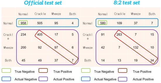We compared our results with the state-of-the-art model result on both the official train–test split and the 8:2 train–test split. The experiment results are shown in Table 2. For the 8:2 train–test split, our final proposed model achieved a 72.72% for the average score and 66.31% for sensitivity, improving the state-of-the-art average score by 4.22%. The model also raised the state-of-the-art sensitivity by 12.61%, which is a massive improvement because the sensitivity is considered a more challenging task than the specificity due to the data imbalance problem. For the official train–test split, our model achieved 51.98% average score, which is the state-of-the-art result if the model is not pre-trained on any other data set. Our model achieved 42.63% sensitivity on the official train–test split, which improves the state-of-the-art result by 2.53%. The details of the confusion matrix are shown in Figure 5. The low sensitivity in the official train–test split can primarily be attributed to the model’s inability to accurately identify Wheeze data. This is due to the scarcity of training Wheeze data available within the official train–test split. There are only 491 Wheeze data and 277 Both data in the train set. However, the results are much better in the 8:2 train–test split because of more sufficient data.