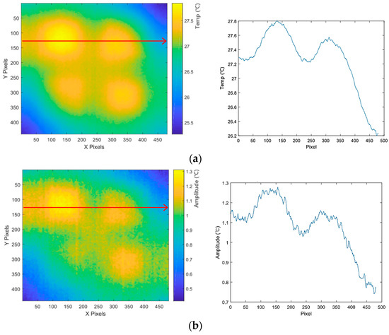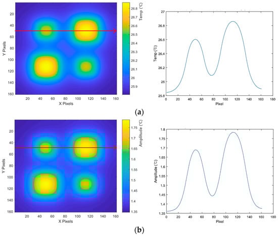 Analysis of LIT experiments results in Test 3 condition (2 kW, 0.01 Hz): (a) temperature image and distribute (#925 frame, 148 s); (b) amplitude image and distribute (#725 step, 116–141–166–191 s); and (c) phase image and distribute (#725 step, 116–141–166–191 s).