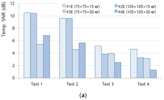 For the LIT thermography data obtained under the four test conditions through the CLP mockup specimen, the thermography image of the comparative analysis time was extracted, and the SNR for each ROI was calculated by analyzing the same method and procedure as the simulation. Figure 16a–c is a graph showing the temperature, amplitude, and phase SNR for each test based on the selected comparative analysis time. Figure 17a–c shows the temperature, amplitude, and phase images of Test 3 as an example.