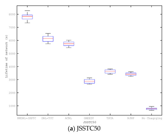 The above experiments discuss the impact of different parameter changes on charging performance based on the preset lifetime. This section compares the lifetime distribution of six mobile charging approaches based on different scenarios, including JSSTC50, JSSTC100, and JSSTC200. To compare the impact of different approaches to prolonging the lifetime, we also add the lifetime distribution of the network where the sensors are not charged. In particular, each approach has been run 50 times, and the results are shown in Figure 11.