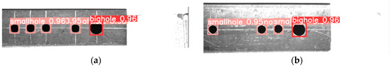 When the camera-to-target distance varied between 15 cm and 25 cm, the proposed method successfully detected both large and small holes. When the distance was increased to 30 cm, erroneous decisions were made. In Figure 11a, the hole pattern located in the bottom left corner is identified as a large hole. Similarly, in Figure 11b, the pattern in the same corner is erroneously identified as both a large hole and a small hole in the workpiece is overlooked. The primary factor contributing to this issue is the significant shooting distance. At such distances, the small holes and the background exhibit similar color characteristics, while the large hole features resemble the hole pattern features of the background plate. Consequently, this similarity poses challenges in extracting the relevant features, ultimately resulting in the missed detection of certain large and small holes.