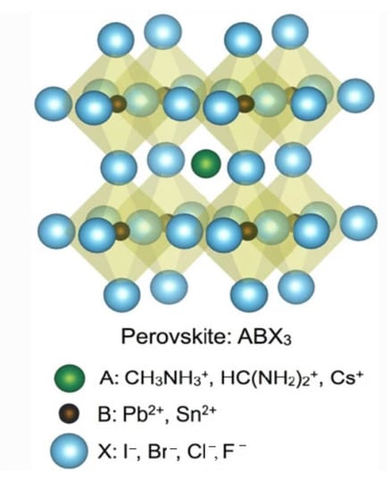 During the past decade, the primary achievement in PV technology has been related to metal halide perovskite materials because they have excellent optoelectronic features, such as very high absorption coefficients, long carrier diffusion lengths, exciton binding energy, and carrier charge balance [,,,,,,,,]. The PCE of PV perovskites has rapidly improved from the initial 3.5% to 26.1% over a short research period [,,,,,,,]. The crystal ABX3 framework is the common structure of metal halide perovskites, as shown in Figure 1, where the A site represents monovalent cations, such as cesium (Cs+), methyl ammonium (MA+), or formamidinium (FA+), whereas the B site is bonded to a divalent cation, such as Sn2+ or Pb2+. The X site is a halide anion (Cl−, I−, and Br−) [,]. More importantly, these materials can be employed in low-cost manufacturing methods, such as roll-to-roll printing, because they have excellent solution-handling properties [,,,]. Owing to these qualities, metal halide perovskites can provide effective and affordable light-absorbing layers for PV applications.
