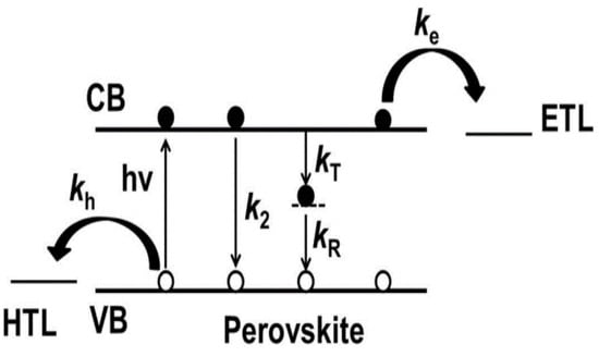 A detailed diagram of the PSC charge dynamics is shown in Figure 6. Sunlight exposes the devices to photons, which the perovskite absorbs and converts into excitons. Owing to the low exciton binding energy, the excitons split into holes and electrons at ambient temperature. The charge-carrier lifetime had a duration of 10–100 ns []. Both the holes and electrons were moved to the perovskite–HTL and perovskite–ETL interfaces under the effect of the electric fields and carrier concentration gradients, respectively. The interface area experiences a continuous potential drop caused by the offsets in the valence and conduction bands, which ensures that charge transport is moved back to the HTL or ETL before their annihilation, typically within a timeframe of 100 ps []. Finally, the corresponding electrodes gather the electrons and holes. The internal quantum efficiency (IQE) should be extremely close to 100% if each absorbed photon produces a different hole–electron pair and all charge transport is gathered by the electrodes [,]. As a result of the carrier recombination occurring in the bulk perovskite or at its grain boundaries, at the interface of perovskite–HTL, or perovskite–ETL and HTL–ETL interfaces when perovskite is missing in some places, the usual IQE of PSCs is approximately 90% [,].