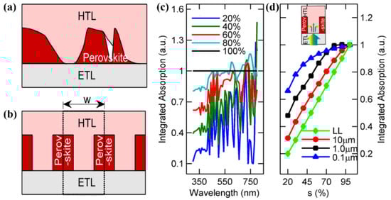 (a) Schematic of PSCs with imperfect surface coverage. (b) Hardware configuration used in the computer simulations. The dashed rectangle with dimension “w” represents the unit cell width. Impact of surface coverage on the device optical properties. (c) Integrated absorption rates over the solar spectrum (300–800 nm) inside the perovskite vs. surface coverage for different unit cell widths, and the integrated absorption of photons inside the perovskite (w = 1 µm) vs. wavelength for different surface coverages are presented in part (d). Reprinted with permission from Agarwal et al. [] Copyrights 2017 by AIP Publishing.