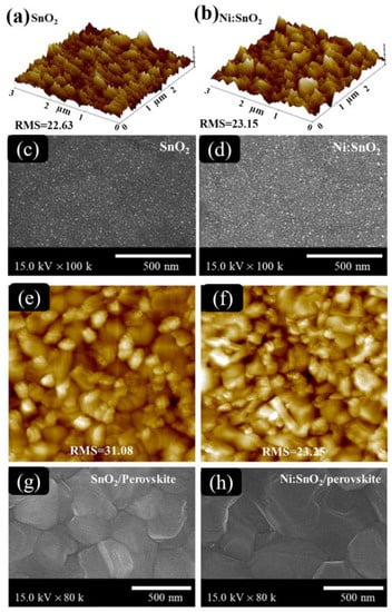 AFM images of (a) SnO2 and (b) Ni:SnO2 layer. Top-view SEM images of (c) SnO2 and (d) Ni:SnO2 films deposited on the pure TCO substrate. Perovskite films were developed on the (e) SnO2 or (f) Ni:SnO2 layer. Top-view SEM images of the absorber substrates grown on the (g) unpolluted control layer and (h) doped SnO2 layer. Reprinted with permission from Quy et al. [].