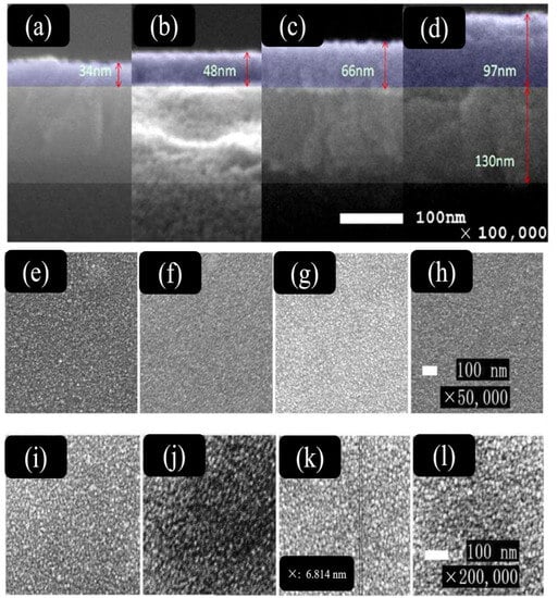 Cross-sectional SEM images of (a) indium-doped tin oxide (ITO)/SnO2 (10%), (b) ITO/SnO2 (15%), (c) ITO/SnO2 (20%), and (d) ITO/SnO2 (30%). Top-view SEM images of (e–h) the prepared ITO/SnO2(x) films at ×50,000 magnification and (i–l) films at ×200,000 magnification. Reprinted with permission from Li et al. [].