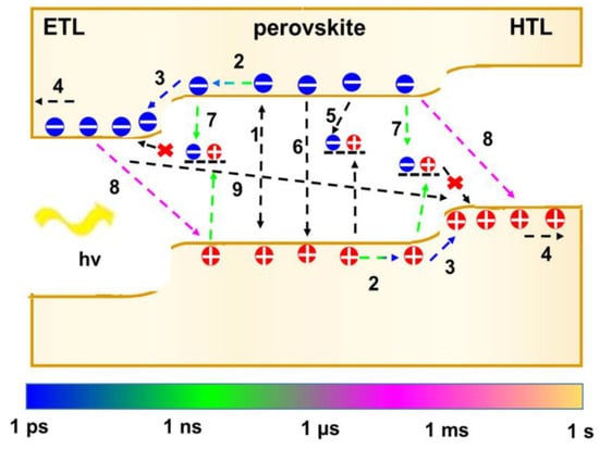 Charge-transfer mechanisms in perovskite devices occurring at various time scales are schematically illustrated by arrows with various colors. Charge extraction into charge transport layers (100 ps), followed by charge collection by electrodes, process 1 (photo-generated excitons split into free electrons and holes), process 2 (electrons and holes diffuse into interfaces for 1 ps to 1 ns), process 3 (charge extraction into charge transport layers), process 4, charge collection by electrodes, processes 5 and 6, bulk recombination in the perovskite layer, process 7 (interface recombination induced by trap states for 1 ns to 1 ms), process 8, non-radiative recombination at the perovskite/contact electrode interface (1 μs to 1 ms), and process 9, recombination between ETL/HTM when perovskite is absent in some areas. Reprinted with permission from Pan et al. [] Copyrights 2021 by AIP Publishing.