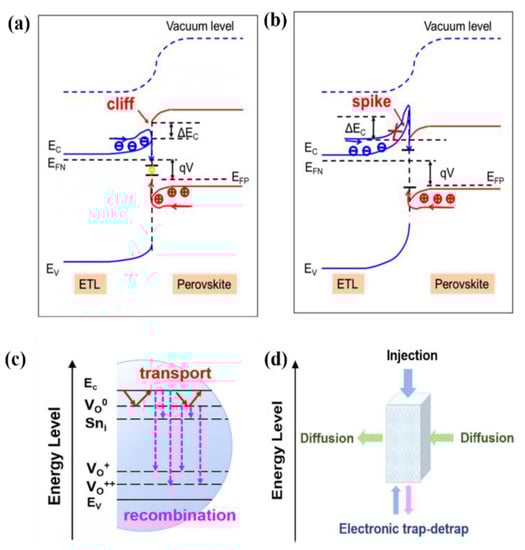 Surface flaws, reverse charge carrier transfer, and mismatched energy levels are the main causes of interface-induced non-radiative recombination. Effective interfaces should block minority carriers and extract only the dominant carriers. Because perovskite and ETLs exhibit distinct bandgaps, a power cliff or spike (EC) must occur at the interfaces, such as that at the ETL–perovskite contact. The ETL carriers could readily go over the barrier to return to the surface in a scenario where there was a surface with a structural cliff. The forward bias condition would result in the annihilation of electrons and holes because of the many defects functioning as recombination foci for charge transport at the ETL–perovskite interface (Figure 7a). An increase in the barrier (EC) against the ETL electron reverse insertion into the interface with a forward bias can result from the spike in the conduction band (CB) at the interface (Figure 7b).