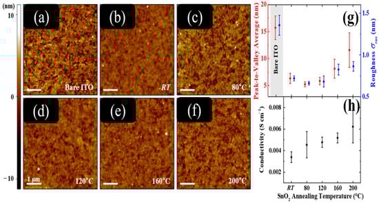 Morphological and electrical characteristics of a SnO2 film. Surface topography of (a) a bare ITO substrate and (b–f) an annealed SnO2 layer at various temperatures. The same color scheme is used to display the AFM images. (g) Roughness values measured as a function of annealing temperature based on peak-to-valley and root-mean-squared values, using bare ITO as a reference. (h) Electrical conductivity of thin SnO2 layers. Reprinted with permission from Yun et al. [] Copyrights 2019, American Chemical Society.