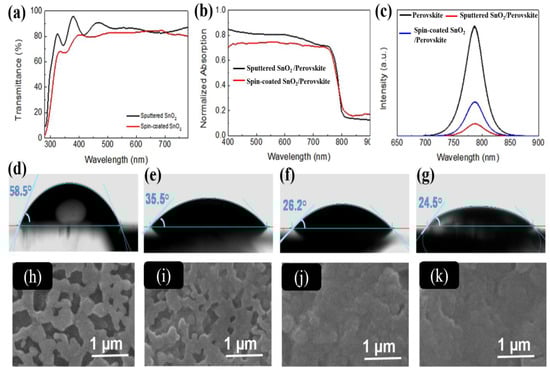 (a) Transmittance spectra of SnO2 films that were sputtered and spin coated and then placed on FTO glass. (b) UV–visible spectrum of SnO2 films that have been spin coated and vapor-deposited with MAPbI3. (c) Photoluminescence spectrum of MAPbI3 that was vapor-deposited and placed on spin-coated and sputtered SnO2 films. Reprinted with permission from Kam et al. [] Contact angle of SnO2 thin films at various UVO exposure times: (d) 0 min, (e) 10 min, (f) 20 min, and (g) 30 min. Perovskite films that were deposited on a layer of SnO2 are shown in the top-view SEM images at (h) 0 min, (i) 10 min, (j) 20 min, and (k) 30 min. Reprinted with permission from Keshtmand et al. [].
