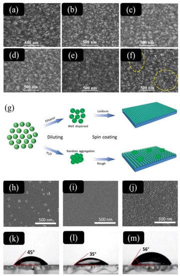 Top-view SEM images of SnO2 deposited on FTO substrate are shown in (a) bare-FTO, (b) pristine SnO2, (c) SnO2-Cl1 (SnO2: 0.003 M NH4Cl), (d) SnO2-Cl2 (SnO2: 0.008 M NH4Cl), (e) SnO2-Cl3 (SnO2: 0.013 M NH4Cl), and (f) SnO2-Cl4 (SnO2: 0.02 M NH4Cl) (non-uniform regions are indicated by the yellow dotted circles). Reprinted with permission from Keshtmand et al. [] Copyrights 2021. Elsevier B.V. (g) Diagrammatic representation illustrating the mechanics of various SnO2 film forms from water and SnO2 precursors that have been diluted with ethanol. SEM images of the SnO2 colloidal dispersion layers that were formed after being diluted with (h) water, (i) ethanol, and (j) DMF. (d–f) Different SnO2 films’ water contact angles for (k–m), respectively. Reprinted with permission from Xu et al. [] Copyrights 2020 International Solar Energy Society. Published by Elsevier Ltd.