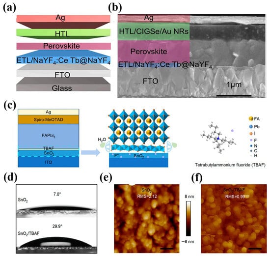 During the formation of the perovskite layer, oleic acid ligands can passivate the trap sites []. Controlling perovskite layer defects can be extremely important for perovskite grain boundaries and ETL–perovskite heterointerfaces, resulting in PSCs with improved solar performance. Enhancing the perovskite crystalline quality can reduce the internal defects of the active layer and current loss caused by the internal non-radiative recombination of the device (Figure 12a). As a result, the PV performance is synergistically improved via the NaYF4:Ce and Tb@NaYF4 nanocrystals acting as light scattering centers, UV down-converters, and defect passivators. A cross-sectional image of the PSCs captured using SEM is displayed in Figure 12b. SnO2 was coated on the FTO conductive glass with a thickness of 20 nm, and spin coating was used to manufacture NaYF4:Ce, Tb@NaYF4 nanocrystals on SnO2 (50 nm). The perovskite active layer, FA0.85MA0.15Pb(I0.85Br0.15)3 (400 nm), was created by using a one-step spin coating technique. Before being added to the HTL, spiro-OMeTAD was mixed with Cu-In0.7-Ga0.3-Se2 (CIGSe) quantum dots and Au nanorods (NRs) (205 nm). A silver electrode (117 nm) was placed on top of the device. The addition of NaYF4:Ce and Tb@NaYF4 phosphor nanocrystals improved the crystalline quality of the perovskite, reduced the recombination of grain boundaries, and boosted the utilization of UV light by light down-conversion. The natural deterioration of perovskites is a possible explanation for this phenomenon. The main reason for this phenomenon was the natural degradation of the perovskite. The NaYF4:Ce,Tb@NaYF4 affected the long-term stability of the perovskite layer because it enhanced the crystallinity of the perovskite films. The increased grain size of the perovskite films reduced the grain boundary density, which enhanced the resistance of the perovskite films to the water and oxygen in the environment. In addition, the main reason for the moderately enhanced device stability of NaYF4:Ce, Tb@NaYF4 nanocrystals was the presence of thinner oily ligands on their surfaces after the synthesis process. The hydrophobic nature of oily ligands enabled the perovskite film to improve its stability under humid conditions. The NaYF4:Ce, Tb@NaYF4 enhancement increased the crystallinity of the perovskite films, which was the key factor affecting their long-term stability. The larger grain size of perovskite films results in a decrease in the grain boundary density, which improves their resistance to oxygen and water in natural environments (Figure 12c) []. The increased hydrophobicity of the improved film helps to increase the interfacial contact, lessen the upper perovskite grain boundary defects, and prevent heterogeneous nucleation. The grain boundary movement was hampered because the wetting surface’s grain boundaries were tethered by imperfections on the ETL surface. As a result, the enhanced hydrophobia suggested that the flaws at the perovskite grain boundaries were being reduced, improving the perovskite active layer’s quality. This could be attributed to the ETL surface’s smoothness and lack of wetness, which inhibit heterogeneous nucleation and promote grain boundary migration. This finding demonstrated that perovskite could grow its grain sizes due to its hydrophobic surface. Less grain boundary defects were present in the larger grain sizes, which reduced charge non-radiative recombination at the perovskite–ETL interface. Figure 12d displays the contact angle measurement results. After the addition of tetrabutylammonium fluoride (TBAF), the contact angle increased from 7.0° to 29.9°. Furthermore, the RMS roughness of the SnO2/TBAF film (0.98 nm) was lower than that of the SnO2 film (2.12 nm) (Figure 12e,f); the former film was smoother and more homogeneous. Owing to the uneven surface, this may provide a superior substrate for the deposition of perovskites and successfully stop further recombination loss. The creation of 1D perovskite (TBAPbI3) favorably inhibits the decomposition of perovskite and the enhanced SnO2(TBAF)–perovskite interface, improving the stability of the modified film. The addition of TBAF to the SnO2–perovskite interface significantly increased the effectiveness and stability of the PSCs. Along with increasing the SnO2 conductivity, the TBAF interface modifier also passivates the perovskite flaws. Additionally, the decomposition of perovskite and phase transition can be efficiently inhibited by the 1D perovskite (TBAPbI3) generated by TBAF and PbI2 in perovskite, which help promote the stability of PSCs. The TBAF multifunctional interface modification resulted in PSCs with a high efficiency of 23.1%, resulting in outstanding thermal and humidity stability.