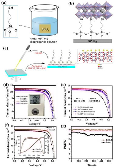 MPTMS connected to the perovskite layer and SnO2. (a) MPTMS molecule’s chemical makeup and the process used to manufacture the MPTMS-modified SnO2 substrate. (b) SnO2/MPTMS/perovskite schematic diagram. Reprinted with permission from Shi et al. [] Copyright 2021 Wiley-VCH GmbH. (c) Xanthate annealing to create a sulfur-functionalized ETL. (d) Current–density–voltage properties of the best-performing SnO2 device with and without 1-, 3-, and 5-times sulfur functionalization (xanthate treatment). A humidity reading from the device’s manufacturing is displayed in the inset. (e) Comparison of the current–density–voltage on standard SnO2 and sulfur-functionalized SnO2 is shown in the inset text, which also includes the computed hysteresis index (HI). (f) Comparison of the best-performing PSC’s current–density–voltage results with and without sulfur functionalization. The related devices’ IPCE spectra are shown in the inset. (g) PSC’s steady output power with and without sulfur functionalization. Reprinted with permission from Wang et al. [] Copyright 2018 Wiley-VCH Verlag GmbH & Co. KGaA, Weinheim.