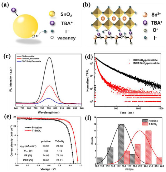 Nitrogen-doped graphene oxides (NGO) were added to SnO2 to boost the efficiency of PeSCs because the oxygen vacancy defects passivated the ETL []. By monitoring the shift from Sn2+ to Sn4+ in the oxidation state of Sn in SnO2, it was possible to determine that NGO successfully passivated the oxygen vacancy defects in the SnO2 layer. The dark-current investigation revealed that the SnO2:NGO composite layer had better electrical characteristics than that of the SnO2 layer. The SnO2:NGO composite layer is an excellent ETL for high-performance PeSCs because it has a superior PCE of 16.5, almost no hysteresis, and a significantly improved VOC and FF. The higher JSC, VOC, and FF values of PeSCs based on SnO2 are in accordance with the time-resolved photoluminescence (TRPL) and VOC dependence on light intensity measurements: effective charge extraction and reduced charge carrier biomolecular recombination from the perovskite to the electrode cause NGO composite layers. This is a useful doping technique that may be applied to construct high-performance PeSCs based on SnO2 at a relatively low temperature. It is also expected that other perovskite optoelectronic devices, including nip-structured perovskite light-emitting diodes (PeLEDs), will perform better when the SnO2:NGO composite layer is used as an ETL, creating a unique method for the surface modification of SnO2 nanoparticles []. Tetrabutylammonium iodide (TBAI) was added to the colloidal SnO2 nanoparticle solution to produce modified T-SnO2 nanoparticles (Figure 15a). TBA+ ions affect the dispersion of SnO2 nanoparticles, whereas I ions can interact with Sn2+ to passivate the oxygen vacancies of SnO2. The Van der Waals interactions between particles lead to aggregation. TBA+ is surface-active owing to the interactions between water and hydrophobic molecules. The weakening of these connections inhibited aggregation. Elemental doping can control the free-electron concentration, which is essential at the Fermi level. The addition of I ions may increase the carrier concentration, raising the Fermi level of SnO2, and hence raising the CB. Additionally, through electrostatic interactions with the anions at the interface, the TBA+ ions serve as a bridge. This structure offers a quick path for electron extraction and transfer, increasing the capacity of the solar cell to collect charge (as shown in Figure 15b). The lower PL intensity in the multilayer of ITO/T–SnO2/perovskite than that in the pristine sample indicates that there was more electron transport from the perovskite to ETL (Figure 15c). Figure 15d presents the TRPL spectra to further illustrate the electron transport and extraction. The T-SnO2-nanoparticle-modified surfaces are responsible for the enhanced energy alignment between the T-SnO2 ETL and the perovskite layer. In Figure 15e, the J–V curves of the devices that excel are based on the T-SnO2 and pure SnO2 ETLs of the nanoparticles. Based on the T-SnO2 ETL, the PSC exhibited a PCE of 21.71%, which was significantly higher than that of a perfect gadget (18.85%). This higher value is due to improved electron extraction and a decrease in the interface defects between the perovskite and T-SnO2 ETLs. The histogram shown in Figure 15f is based on the PCE distribution observed from 22 slices of various ETLs. The average PCE of the devices built using the T-SnO2 ETL was higher (19.8%) than that of the reference device. By filling the iodide vacancies at the ETL–perovskite interface, the I- of the T-SnO2 nanoparticles passivated the interface defects, indicating that the lowered trap density for the perovskite film depended on the particle layers.