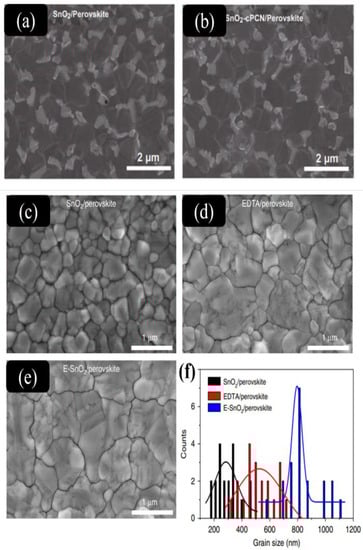 “Roughness” is a term that refers to the surface morphology of a material. Atomic force microscopy (AFM) and scanning electron microscopy (SEM) were used to assess the surface morphology of the coated films, where a smooth and dense surface is attributed to a good substrate with a low root-mean-square (RMS) roughness value. Currently, the SnO2 ETL surface and the perovskite surface coated on the SnO2 ETL are characterized as rough surfaces; however, the AFM of perovskite is beyond the scope of this review.