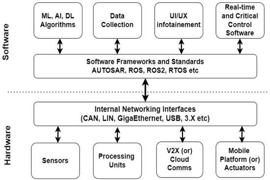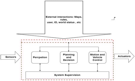 Further, this section discusses the basics of sensor technology, how AVs perceive their environment data using the sensors, various types of sensors, and a brief introduction to data fusion. While AV systems differ slightly from one another, they are usually complex systems with several sub-components. The layout of an AV model may be divided into two stages, according to several perspectives: the hardware and software tools in the initial step, and the functional perspective required for the AD system’s operating units in the second stage. From a technical perspective, the two main tiers are hardware and software, with individual components representing various facets of the entire AV platform in each layer. Communication infrastructure is provided by a number of AD sub-components that operate between the hardware and software levels. Clarification, agility, automobile controller, system tracking, organization, and policy-making are the main operational components of AVs. These operational units’ duties center on information flow from perceived data to vehicle control, data collection, and data analysis.