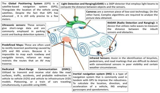 Cameras: One of the most extensively utilized devices for monitoring the environment is a camera. A camera detects lights emitted by the surroundings on a photosensitive surface (image plane) through a camera lens to produce clear pictures of the surroundings (placed in front of the sensor). With the right software, affordable cameras can snap high-resolution pictures related to their surrounding environment as well as recognize mobile and immovable impediments in their range of view. These characteristics enable the vehicle’s vision system to recognize various objects in off-road vehicles in addition to road signs, traffic signals, road lane markings, and obstacles in on-road vehicles. One of our articles [] provides a comprehensive analysis of various sensors, outlining their distinct characteristics. Figure 3 illustrates the overview of sensors fixed in AVs.