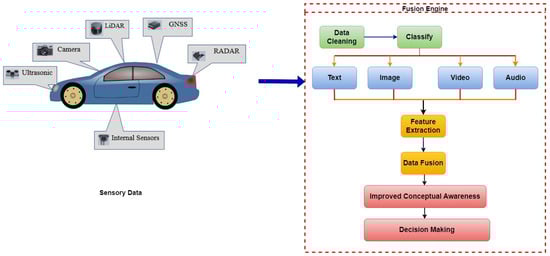 Sensory data fusion (SDF) is the act of combining various data sources to provide information that is more consistent, reliable, and relevant than any single data source. Data fusion improves the accuracy of raw sensory input gathered from many internal and external sensors, hence enhancing the AVs’ conceptual awareness. Sensor data often exhibit multimodal characteristics. Multimodal data are difficult to process, and hence they must be fused and converted into a unique data format that simplifies further processing. Due to the complexity prevailing in data fusion, advanced mathematical models are used for transformations and calculations.