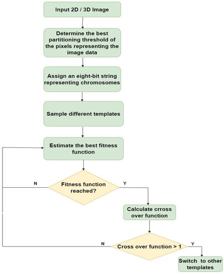 Figure 6 illustrates the flow of the proposed genetic-algorithm-based edge detection model, and Algorithm 1 elaborates the overall functioning of the genetic algorithm. Equation (3) displays the proposed crossover function, whose value determines whether the genetic algorithm must switch between different templates to determine the maximum fitness function.