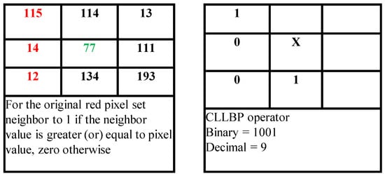 Figure 7 illustrates the mechanism behind the proposed color detection method. The pixel colored in green signifies the pivot pixel, while the pixels colored in red denote its neighboring pixels. The pivot pixel whose color is to be examined is taken into consideration. Its corresponding neighboring pixel values are compared with the gradient value, which is computed using the equation specified in Algorithm 2. If the pivot element’s neighboring pixel value is greater than or equal to the gradient, then its original pixel value is replaced with the value of one, else a zero value is substituted with its original pixel value. Now, the binary bit patterns obtained from the sub-matrix give the actual color value of the pivot pixel since most of the RGB values of the color are between the numeric range of 0 and 255. The logic adapted in the proposed edge detection model is used to find the height and the width of the image. The first and last edge present in the column of the image matrix determines the height of the image while the first and last edge present in either of the row values of the image matrix represents the width of the image [,].