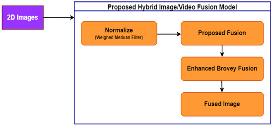 Algorithm 2 explains how the color value of a pixel is examined in image data. Figure 8 illustrates the functionality of the proposed hybrid image fusion model. In the first stage, the sentinel 2D images are acquired from different sensors. Then the image is normalized using the weighted median filter method to convert 2D pixel intensity to 3D pixel intensity. After normalization, the mandatory features, namely color, edge, height, and width, are extracted from the images using the proposed edge and color detection models. In the third step, appropriate proposed projection and transformations are applied to convert 2D pixel and wavelength intensities to corresponding 3D information. The data obtained are successfully fused with a sample 3D image. This mechanism converts the acquired 2D image to a 3D image. The obtained multispectral 3D image lacks in its clarity related to the RGB colors. In order to improve the RGB color intensities, the obtained 3D image information from the suggested fusion model is integrated with the Brovey fusion method, which increases the RGB color intensity of the fused image to an appreciable extent [,]. As discussed in the above paragraph, the suggested hybrid fusion model involves key matrix and vector operations such as projection, transformation, and transposition.