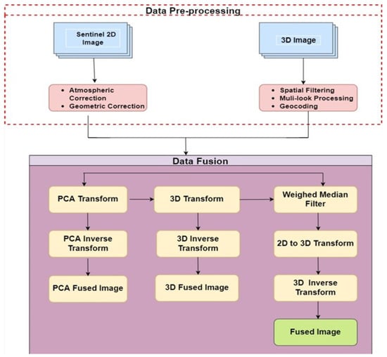 Before processing the fusion process initially, the intensity of each wavelength is subtracted from the values of both the 2D sentinel and 3D images. The mean intensity wavelength for both the 2D and the 3D images is calculated using the weighted mean filter method. In terms of mathematics, the weighted mean filter (WMF) is equivalent to global optimization. It can successfully filter images without causing significant edge blur. Within a local window, it is an operator that replaces the current pixel with the weighted median of nearby pixels. In processing pixel (p) in the image (I), only pixels inside the local window, R(p), of radius (r) centered at (p) are considered. WMF connects each pixel, , with a weight, , in the appropriate feature map (f), i.e.,