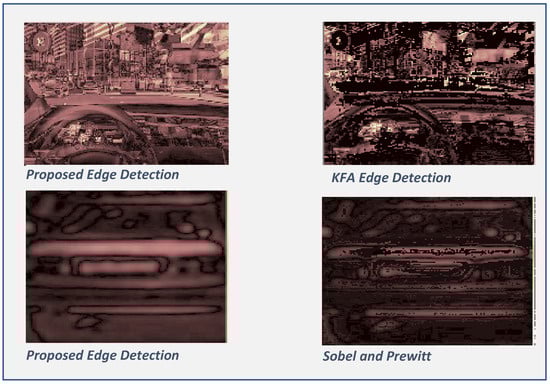 The final fused images obtained using the proposed and other popular fusion models are evaluated using various metrics including standard deviation, average gradient, spatial frequency, peak signal-to-noise ratio, and correlation cofactor. A sample of three fused images obtained from different models is considered for evaluation. The proposed fusion models perform better than the other popular fusion models. Table 5 portrays the results obtained after evaluation. The impact of the metrics can be visually seen in Figure 14 and Figure 15. The study also evaluated the proposed edge-detection model with other popular edge-detecting models such as KFA (Kalman filter algorithm) and Sobel & Prewitt. Root mean square error (RMSE) values of the images obtained after edge detection are estimated. The lower the RMSE values are, the higher is the accuracy of the constructed image. The accuracy of the proposed edge detection model is better than the other popular edge detection models. RMSE is calculated using Equation (23), and Table 6 illustrates the RMSE values obtained from different edge detection models for different images. The results show that the proposed edge detection model provides a lower value of RMSE, which indicates the improved accuracy in image construction over the other popular edge detection models. Figure 14 illustrates the results obtained after implementing the proposed and other popular edge detection models. From the results, it is evident that the images constructed after implementing the proposed approach are better than other popular edge detection models.