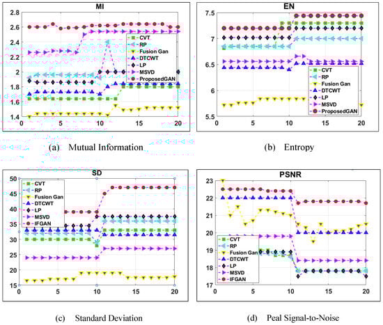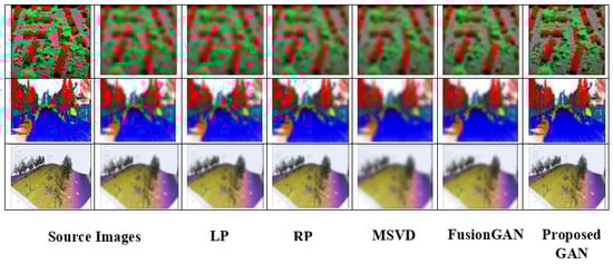 Figure 16 illustrates the performance of various fusion models for the metrics (MI, EN, SD, and PSNR). A sample of 30 point cloud scenes was taken, which analyzed the performance of various popular fusion models along with our extended GAN model for four metrics, namely MI, EN, SD, and PSNR. From the results, the proposed GAN outperformed other fusion models. Table 9 depicts the CPU time consumed by different fusion models to fuse 2D image data and 3D point cloud data. A sample of 10 images was collected from the nuScenes and GeoTiles dataset to evaluate the efficiency of the fusion models. Once again, the proposed fusion models performed better than the other fusion models. Again, a sample of three 3D point cloud data from the GeoTiles dataset along with their blurred images (since it was difficult to obtain blurred images from the dataset, online applications to blur the selected images were used) was taken to analyze the performance of different fusion models. From the analysis, it was observed that the fusion accuracy of the proposed GAN model was better than other fusion models. Figure 17 depicts the fusion results of various fusion models used to fuse 3D point cloud data sampled from the GeoTiles dataset.