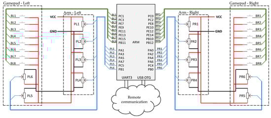 The electronic control board of the remote control device is based on a microcontroller responsible for reading the sensors and sending the commands to the robot. Figure 3 shows the schematic diagram of the board and its connections with the sensors. The microcontroller used is the STM32F407G microcontroller from ST Microelectronics (Geneva, Switzerland). This microcontroller includes an ARM Cortex-M4 32-bit processor with a clock frequency of 168 MHz. The chip also packages 1 MB of non-volatile flash memory for user code and 196 kB of internal SRAM. The STM32F407G provides a wide variety of hardware peripherals such as precision timers, USART, I2C, SPI, CAN, and USB OTG communications, as well as three 12-bit Analog to Digital Converters (ADC) that can be configured to sample different input pins, two Digital to Analog Converters (DAC), two General Purpose Direct Memory Access (DMA) controllers and 80 General Purpose Inputs and Outputs (GPIO) pins. The sensors used are one potentiometer at each arm joint and multiple selection buttons on the auxiliary gamepads placed on the hands’ region.