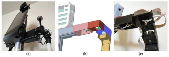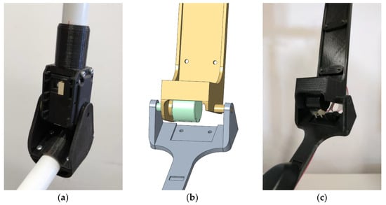The shoulder of the remote control device acquires three DOFs with the same method as the aforementioned, but using potentiometers instead of motors. The casing of the first potentiometer is fixed to a 3D-printed part that is statically joined to the main structure of the device. The second potentiometer is fixed to the shaft of the first one, and the third potentiometer is fixed to the shaft of the second one using 3D-printed parts. Finally, a part simulating the arm of the remote control device is fixed to the shaft of the third potentiometer. Figure 4b shows the CAD design of the shoulder of the remote control device with the same view orientation as Figure 4a. Each independent 3D-printed part is represented in a different color to enhance comprehension, potentiometers are represented in green, and the main body of the structure is grey. Figure 4c shows the implementation of the shoulder in the remote control device with the same view orientation as Figure 4a. In this case, 3D-printed parts and potentiometers are black.