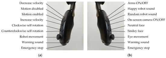 The arms of the mobile robot include figurative representations of human hands that are not articulated. Instead of replicating the figurative hands, the remote control device includes a gamepad at the end of each arm. Figure 6 shows the gamepads, which have multiple buttons and one joystick each. The buttons provide access to some specific mobile robot functionalities without releasing the arms from the device during robot telecontrol. Figure 6a shows the functions associated with each button in the right hand and Figure 6b in the left hand. For example, the gamepad corresponding to the robot’s right arm (Figure 6a) allows telecontrolling the motion of the robot, and the gamepad corresponding to the robot’s left arm (Figure 6b) allows controlling the eye movements, the facial expression and the sounds emitted by the robot, as well as the activation and deactivation of the robot arms and the on-screen camera. In both controllers, there is an emergency stop button and a button to emit a warning sound in case of emergency. The inclusion of these two gamepads increases the versatility of the remote control device presented because it enables a direct control of the main robot functionalities.