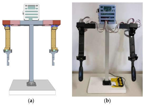 Figure 7 shows the CAD design and the final implementation of the remote control device. The assembly is composed of a base that supports a central T-shaped mechanical structure with two arms and an electronic control board attached. The fixed structure is made of an aluminum structural profile with 3D-printed parts fastened to hold the arms. The electronic control board is inside a casing that is joined to the top of the main structure. The connections between the electronics, the potentiometers and the gamepads are made via bus cables. The distance between both shoulders is 0.43 m, their height from the base is 0.52 m, and the total length of the arms is 0.42 m. These dimensions allow the teleoperator to control the robot by standing behind the device and using its arms as an extension of their own arms.