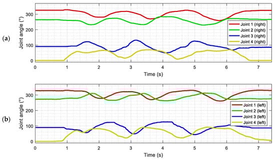 Joint trajectories are the evolution of the angular values of each joint over time, and they define the performance of the imitation []. The target joint positions established in the remote control device have been monitored to assess the information submitted to the mobile robot.