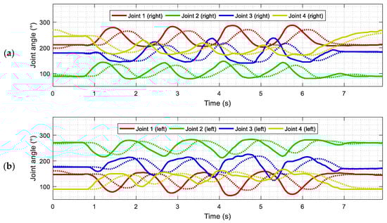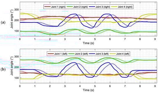 Evolution of the joint angles when the arms of the mobile robot perform four circular inwards trajectories in the air: (a) right arm; (b) left arm. Solid lines depict the joint position received by the mobile robot, and dotted lines depict the real evolution of the joints of the robot.