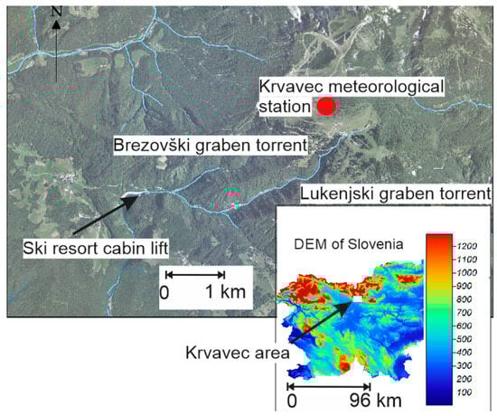 The Krvavec ski resort area is part of the Kamnik-Savinja Alps, a mountain range located in the northern part of Slovenia (Figure 1). The total area of Kamnik-Savinja Alps in Slovenia is around 1000 km2, and there are several mountains with elevations above 2000 m a.s.l., with the highest one being Grintovec Mountain with an elevation of 2558 m a.s.l. The Krvavec ski resort stretches from around 1500 m a.s.l. to around 2000 m a.s.l. The area is characterized by steep slopes and narrow valleys (Figure 2). The cabin lift is the main means of transport for skiers in winter during the ski season. As can be seen from Figure 1, there are two steep torrential ravines (i.e., the Brezovški graben and the Lukenjski graben) in the upstream slopes from the station of the cabin car. The average longitudinal channel slope of these two torrents is ~25–30%, and the total catchment area is close to 2 km2 []. Around three-quarters of both catchment areas are forested, while the rest are agricultural areas [].