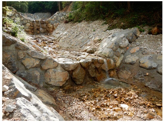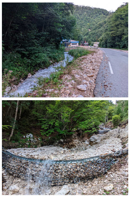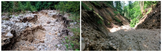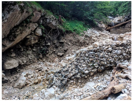 In both torrents and prior to the May 2018 debris flood, there were several countermeasures, such as smaller check dams, gabion walls, wooden dams and low weirs already built to mitigate torrential hazards. However, these objects were destroyed to a large extent during the May 2018 event (Figure 5). Therefore, in order to mitigate the torrential risk in the future, new structural measures were planned for both torrents [,].
