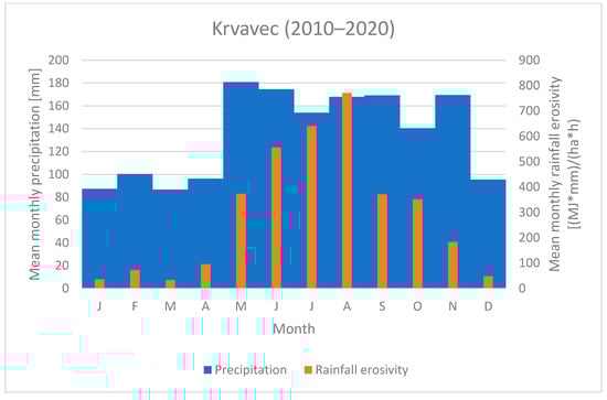Mean monthly precipitation and rainfall erosivity at the Krvavec meteorological station in the period 2010–2020.
