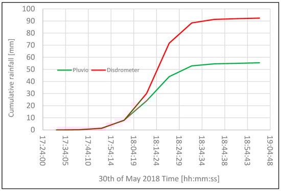 Measured cumulative rainfall using an optical disdrometer and a pluviograph at the Krvavec meteorological station at 1742 m a.s.l. during the extreme event that occurred on 30 May 2018.