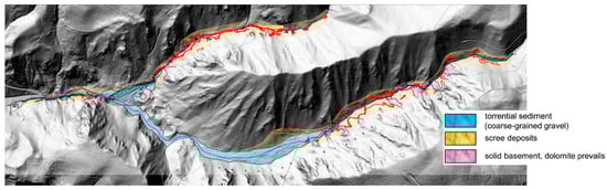 After the May 2018 event, a geological survey was carried out to determine geological conditions for planning and executing new mitigation measures (Figure 6). The main objective of the field survey was to estimate the possibility and magnitude of future mass movement and debris flood events. Areas with deposited debris material and areas with high erosion potential (Figure S1) were identified to secure input data for debris flood modeling and countermeasures design process.