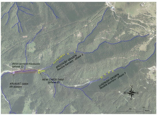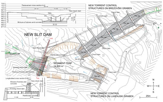 Mitigation measures were roughly divided into three sections, respectively, phases (Figure 7). The first phase was a restoration of existing concrete structures (channel regulation works) on the Reka torrent, i.e., downstream of the Brezovški and Lukenjski torrents confluence. The second phase was planning and building a large slit check dam just downstream at the confluence of both torrents to temporarily retain future mass flows and slowly dose debris to the downstream section. In this location, there was already a small check dam, but the capacity of the sediment trap was only about 500 m3, which is a relatively small capacity compared to possible future events magnitude (volumes). A new slit check dam is designed with the largest possible sediment capacity in this location of close to 14,000 m3. The third phase includes measures to reduce erosion potential in the Brezovški and Lukenjski graben catchments. Both upstream sections have a large erosion potential, and a large amount of mixed coarse and fine debris material can be mobilized during future rainfall events. Since the area is hardly assessable even on foot, non-conventional countermeasures were sought. As an appropriate structure, a flexible ring-net debris flow barrier was selected, which can be transported to a construction site with helicopters or forestry cableways. No heavy machinery (such as excavators) is needed for installation—as it could not be applied—and light machinery was applied (such as so-called spider excavators). The main objective of the third phase was to reduce in-channel erosion intensity via stabilization of the torrent channels (side-slopes reduction at the same time). Geological information shown in Figure 6 was used for the selection of the optimal locations of the flexible net barriers. All three phases together present a holistic technical solution for this endangered torrential area and will reduce mass-flow-related hazards for downstream areas (cabin lift valley station, access road, Grad village, etc.).