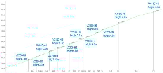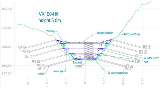 All the barriers were designed and dimensioned using the DEBFLOW online tool developed by Geobrugg []. The design of the barriers was modified because the deposits are not intended to be removed after the events, but the main purpose of the barriers is to reduce channel slope, reduce velocities and support unstable channel banks. Because of this specific design, not all barriers are designed for debris flow impact, but all of them are designed for overflowing forces. The upstream barriers and the barriers with larger distances to the next upstream barriers are designed for debris flow impact, which is one of the possible scenarios in the phase where barriers will be filling up with sediments. The final state of the barriers will be, when all of them are filled up, torrential bed slope reduced and bank erosion mostly mitigated. Based on the topographic characteristics, VX-type (Geobrugg) barriers were selected [] (Figure 11). Some of them were customized with additional ropes and anchors since there was no need to use stronger, more resistant nets, but only to add some ropes to fulfill all the design requirements (stability, resistance).