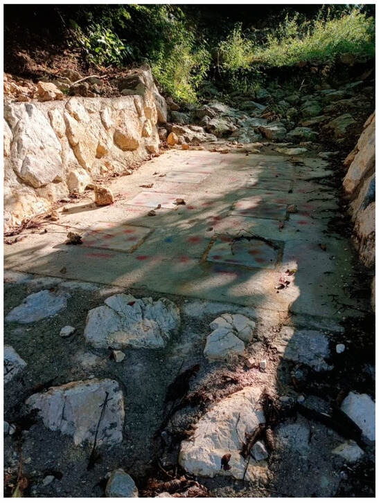 - A field test site for concrete abrasion measurements due to sediment transport in torrential streams; in the bottom of the Brezovški graben a concrete flat ramp appr. 2.5 × 4.5 m was built in with an array of the total eight concrete square 5 cm thick plates (4 × 2 smaller concrete plates of the dimensions 50 × 50 cm prepared from four different concrete mixtures—two plates of each mixture) (Figure 12). One concrete mixture was a typical one used in torrent control works in Slovenia, and the other ones were prepared with additives, such as microsilica and steel fibers, to enhance their abrasion resistance. The plates are leveled in height with the ramp, not cast into the ramp but put in place so that they can be easily removed after the end of the field test. The ramp and the plates are regularly measured by terrestrial laser scanning to estimate abrasion depth on the plates due to overflowing sediments. Since flexible barriers were put in place in late 2022, concrete abrasion is rather limited and cannot be reported in this article yet. We expect that in situ measurements of concrete plate abrasion will correspond well with the standardized laboratory tests for underwater abrasion of concrete []. Positive experiences regarding concrete abrasion resistance of different concrete mixtures typically used for hydraulic structures were gathered in the past on the Lower Sava River in Slovenia [].